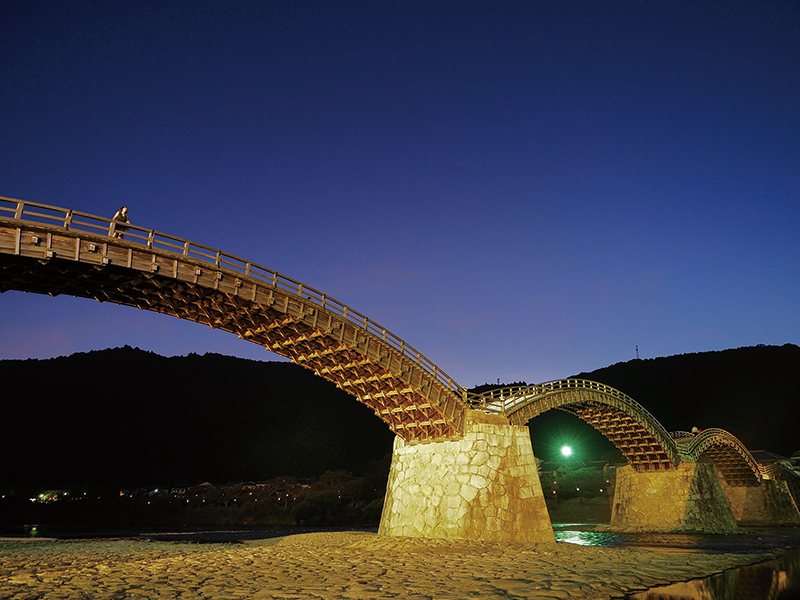 日本三名橋の1つに数えられる全長約200mの美しい五連アーチの木造橋。江戸時代初期の1673年に創建されたもので、長さ193.3m 幅5mの五連アーチを描いています。春にはソメイヨシノをはじめとする約1500本の桜、夏には木々の緑、秋には紅葉が彩を添え優雅な景観が広がります。繊細な木組みの技法によって建設された独創的なアーチ構造は渡って見るだけでなく、屋形舟に揺られながら水面から見上げるのも醍醐味の一つ。また、桜の時期をはじめ、四季折々にライトアップされた錦帯橋がご覧いただけます。
